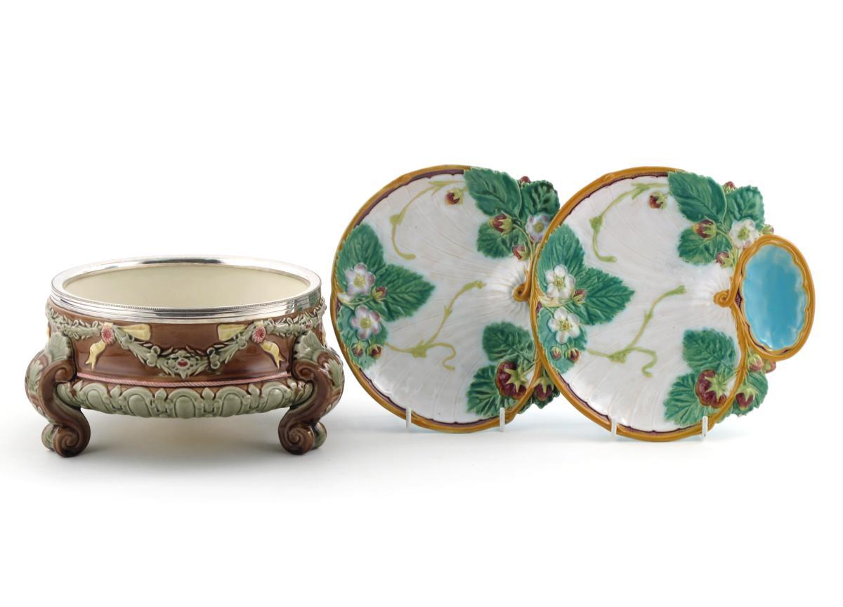 A pair of Minton Majolica strawberry dishes c.1869, moulded with fruit, flowers and leaves, impressed marks and date code, and a Wedgwood Majolica three-footed bowl with a silver metal rim, 25cm max. (3)