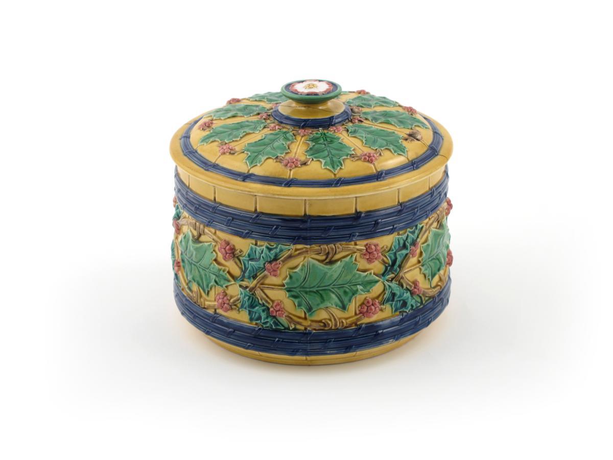 A Minton Majolica Christmas tureen and cover 19th century, moulded with a band of holly leaves between blue straw bands on a yellow ground, impressed mark and indistinct date code, the cover broken and restuck, 18.5cm. (2)