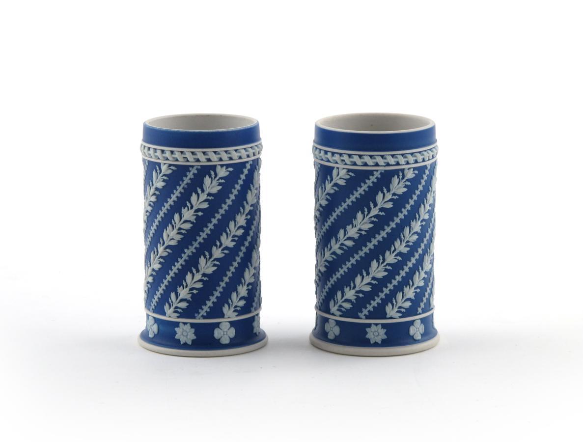 An unusual pair of Wedgwood Jasperware spill vases 19th century, applied with spiralling bands of leaves above a band of flowerheads and beneath a twisted ribbon border, impressed marks, 10cm. (2)
