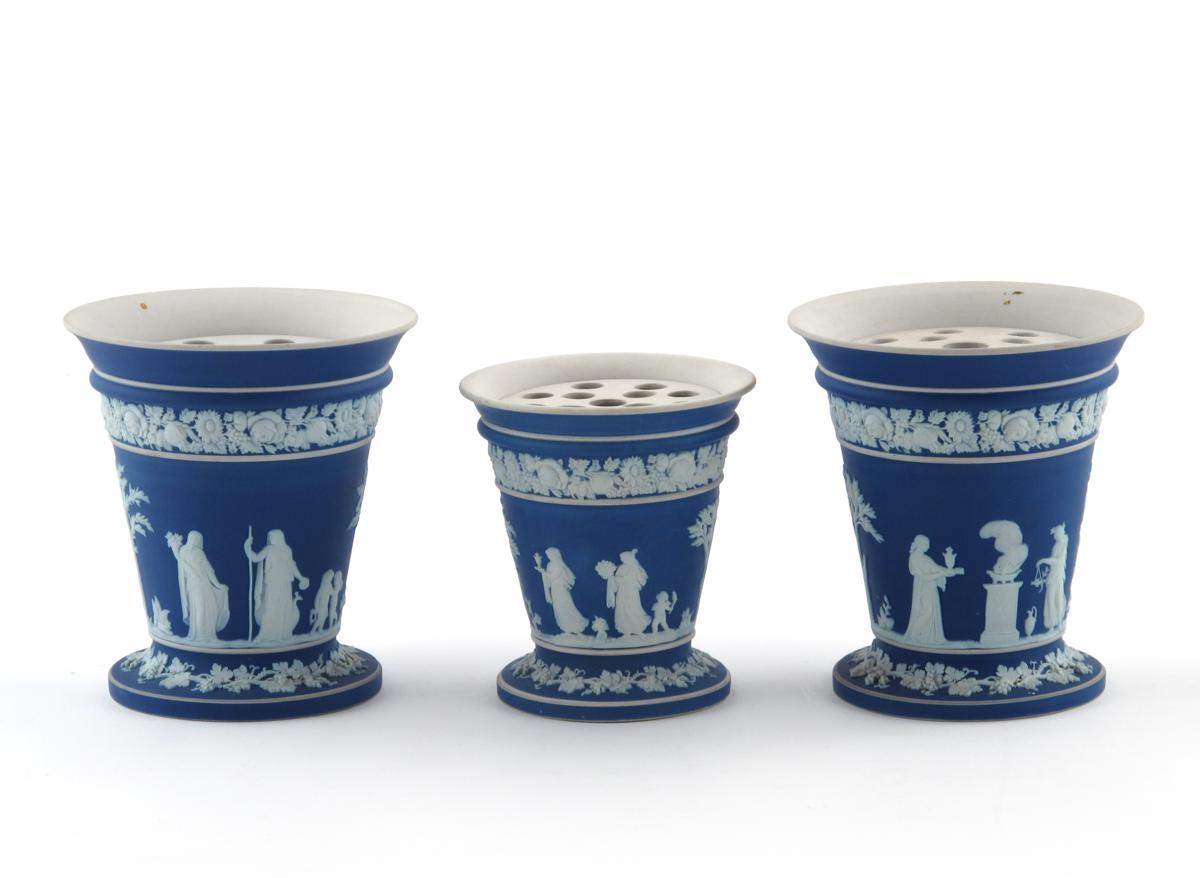A Wedgwood Jasperware garniture of three vases and covers c.1900, the flared forms applied with Classical figures, putti and trees within bands of grapevine and flowers, the circular covers pierced with holes, impressed factory marks, 14.8cm max. (6)