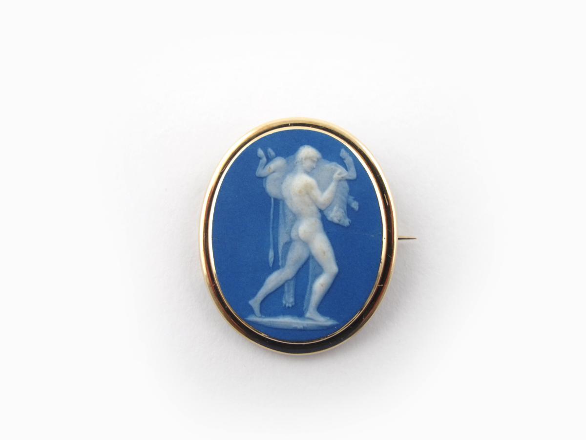 A Wedgwood Jasperware cameo brooch late 18th / early 19th century, probably after a design by John Flaxman, applied with Hercules carrying the slain Cretan Bull over his shoulder, with a gold metal mount, 2.2cm.