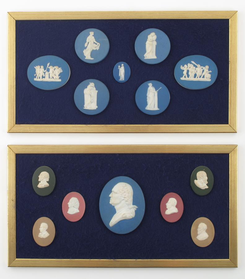 Fourteen Jasperware plaques mounted on two boards early 19th century
