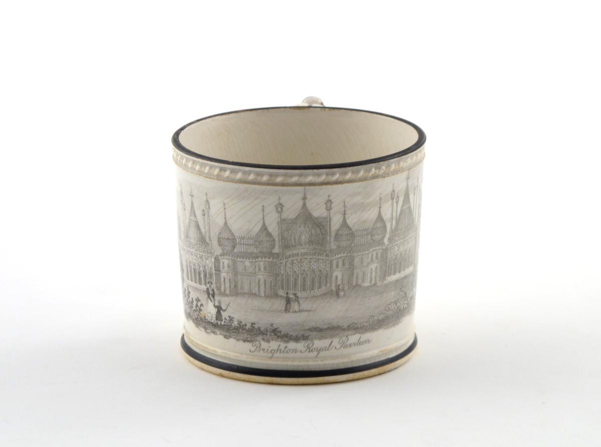 A small pearlware printed mug 1st half 19th century, printed in black with a titled view of the Royal Pavilion at Brighton, 7cm high.