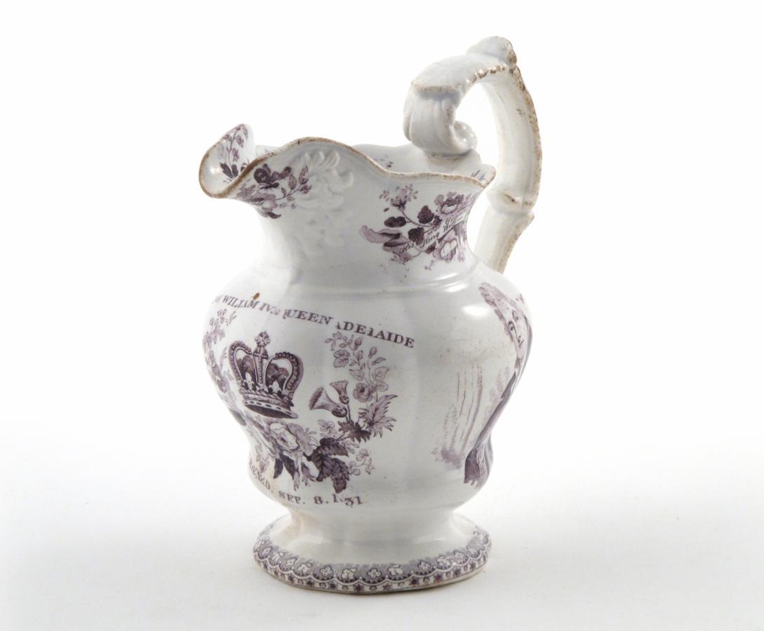 A commemorative Coronation jug c.1831, printed in purple with King William IV and Queen Adelaide, inscribed with their names and 'Crowned Sep. 8. 1831', 17.5cm high.