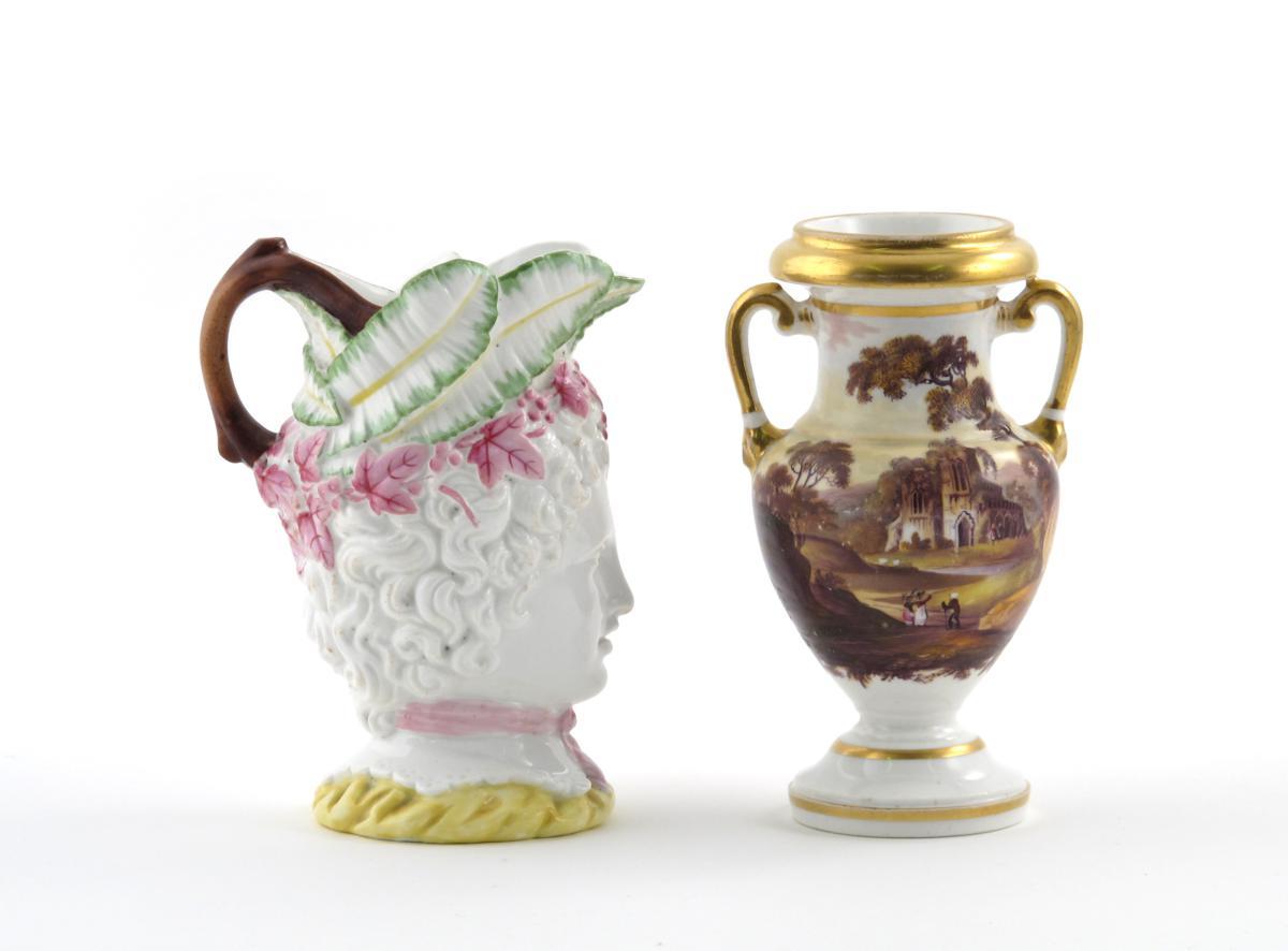 A Ridgway porcelain two-handled vase mid 18th century, painted in pattern 3/635 with figures before a ruined abbey, the reverse with a bridge before a stately home, and a porcelain mask jug, with detail highlights in green, pink and yellow enamels, 15cm. (2)