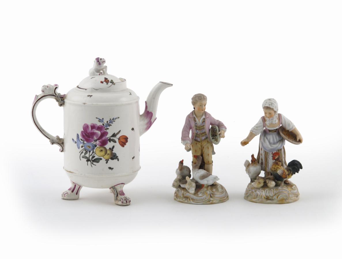 A Ludwigsburg footed coffee pot and cover 2nd half 18th century, painted with flowers, with a lion finial and raised on three clawed feet, blue crowned CC mark, and a pair of 19th century Volkstedt figures of a girl feeding chickens and her companion feeding ducks, the coffee pot's handle broken and repaired, 18cm max. (4)