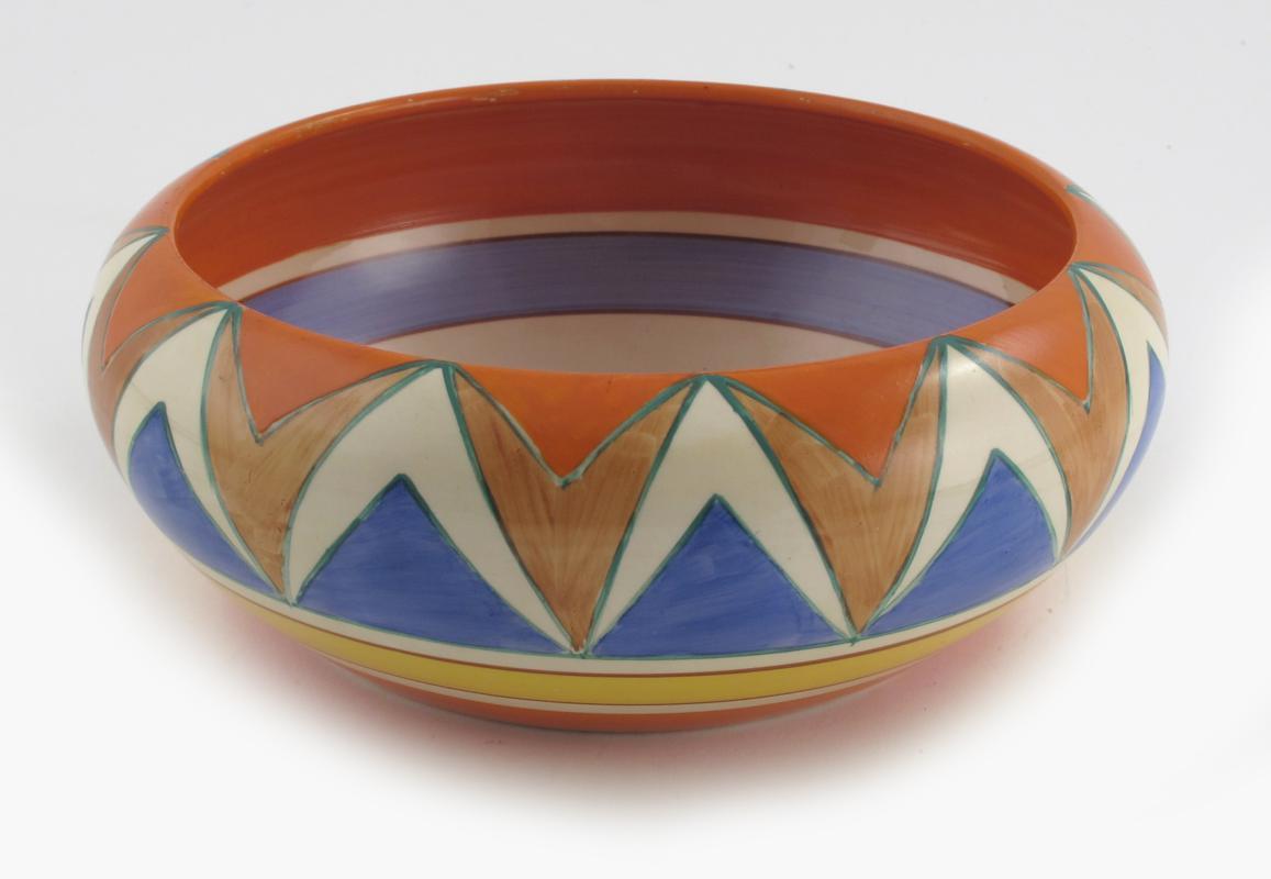 'Original Bizarre' a Clarice Cliff Hiawatha bowl, painted with chevron design to the shoulder in orange, brown and blue, outlined in green printed mark, 22cm. diam.