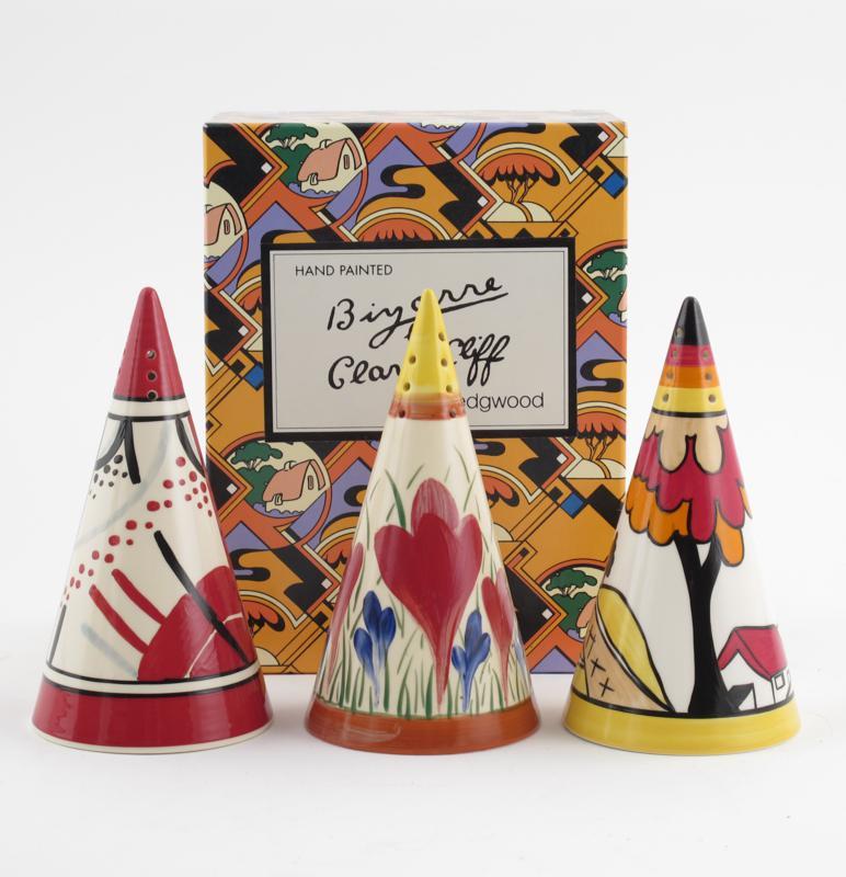 'Carpet' and 'House and Bridge' two modern Wedgwood Clarice Cliff conical sugar sifters