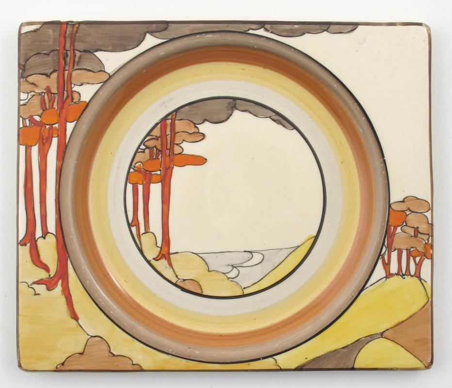 'Coral Firs' a Clarice Cliff Bizarre Biarritz plate, painted to the well and rim in colours printed factory mark 18.5cm. wide