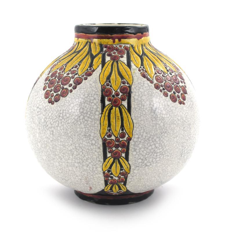 A Boch Freres Keramis vase, designed by Charles Catteau, model no. D.746, ovoid form enamelled with pendulous flowers in yellow and red on a crazed white ground printed factory marks, restored hairline to top rim 24cm. high