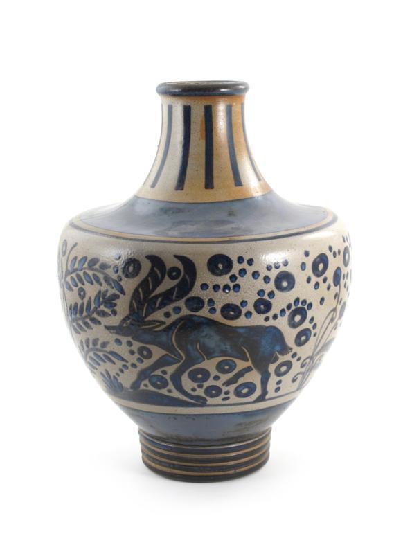 A massive Boch Freres Primavera stoneware vase, painted in blue and black with deer in a landscape, on an oatmeal ground impressed Primavera France 46cm. high
