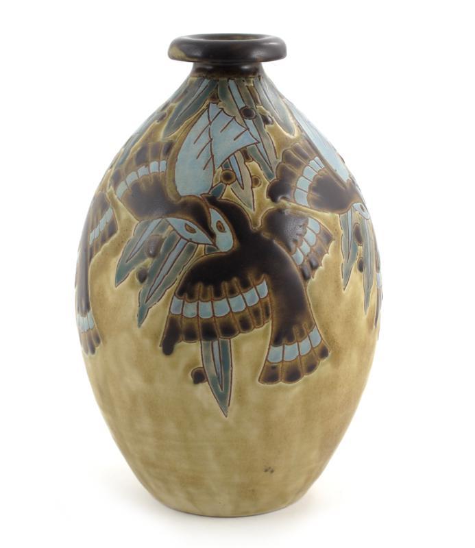 A Boch Freres Gres Keramis stoneware vase, designed by Charles Catteau, model no. D1230, enamelled with stylised flying birds, in lavender, green and brown on a sand ground printed and impressed marks 29cm. high