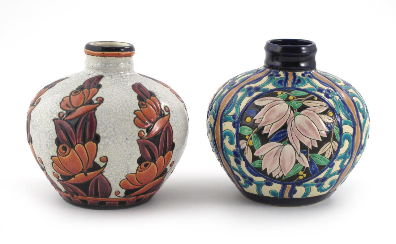 A Boch Freres Keramis vase, model no.D.2809, enamelled with roundels of bell flowers inside a border of foliage, in colours printed factory marks 17cm. high