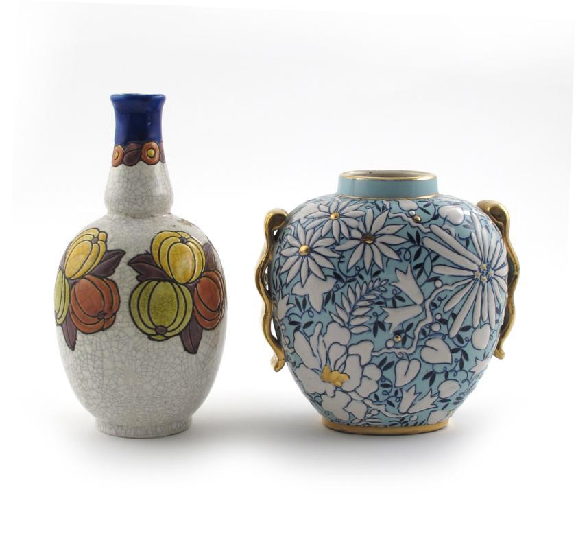 A Boch Freres vase, twin-handled form, enamelled with flowers and foliage, in blue on a pale blue ground, highlighted in gilt, and a Boch Freres solifleur vase printed factory marks, 17cm. high