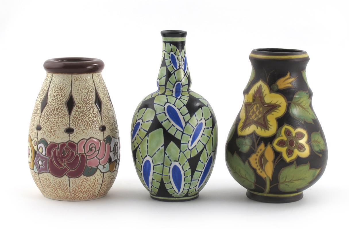 A Boch Freres Keramis vase, model no. D968, painted with geometric leaf design in shades of blue and yellow on a black ground, another vase and an Amphora Pottery vase painted marks 21cm. high