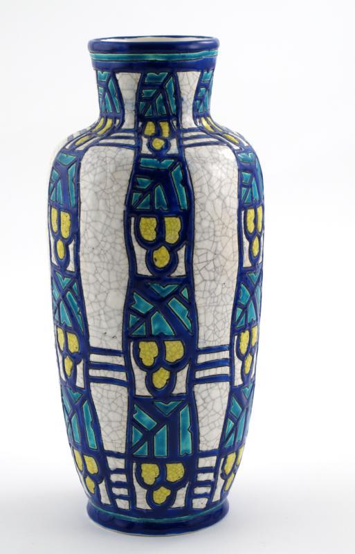 A Boch Freres vase designed by Charles Catteau, enamelled with columns of geometric design in yellow, blue and turquoise on a crazed white ground printed factory mark, facsimile signature 34cm. high