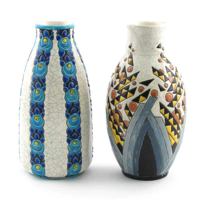 A Boch Freres Keramis vase, designed by Charles Catteau, model no.1210, enamelled with geometric motif on a crackled white ground, and another decorated with columns of flowers printed factory mark, restored neck, 30cm. high