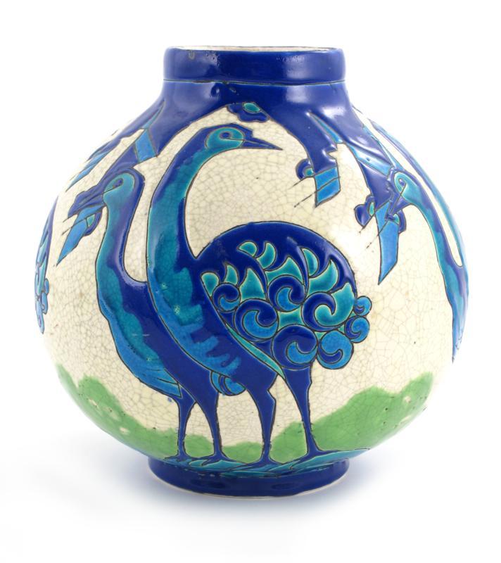 A Boch Freres Keramis Pottery vase, designed by Charles Catteau, model no.D.1506, ovoid with collar rim, enamelled with birds in shades of blue and turquoise on a crackled cream, above jade green foliage ground printed factory marks, 23cm. high