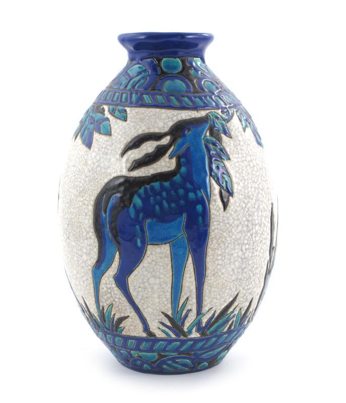 A Keramis Pottery vase designed by Charles Catteau, model no. D.943, painted with three deer grazing and alert, in blue, turquoise and black on a crackled white ground printed factory marks 31cm. high