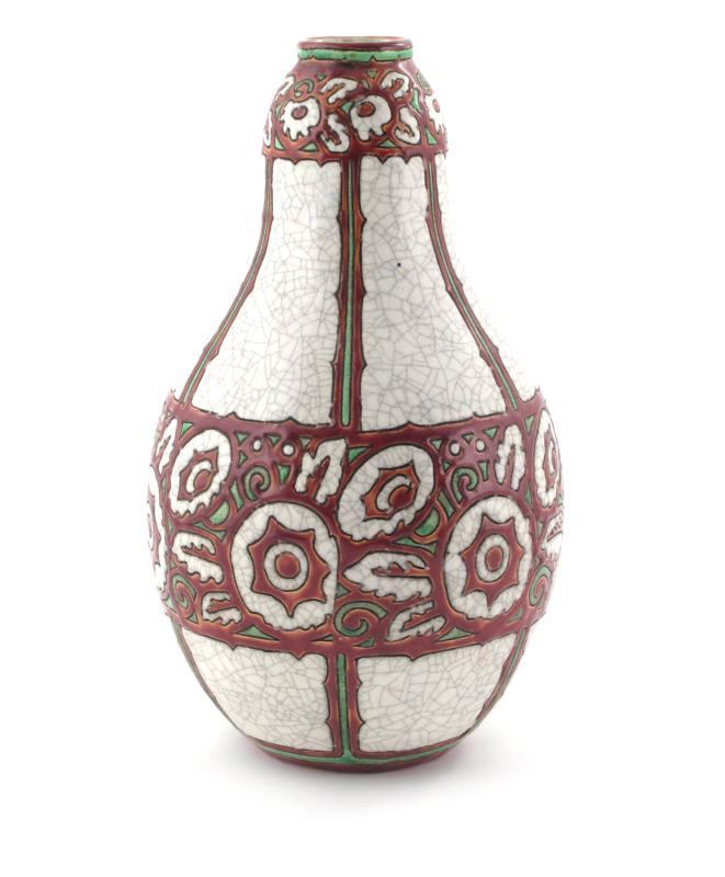 A Boch Freres Keramis vase, designed by Charles Catteau, model no.D983, enamelled with panels of geometric flowers, in red and green on a crackled white ground printed marks, facsimile signature 29cm. high