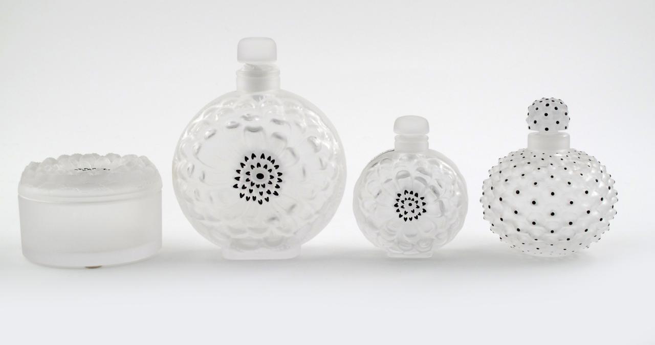 'Cactus' a modern Lalique frosted glass scent bottle and stopper, with black enamel, two graduated Dahlia scent bottles and a Dahlia powder box and cover etched marks, 10cm high