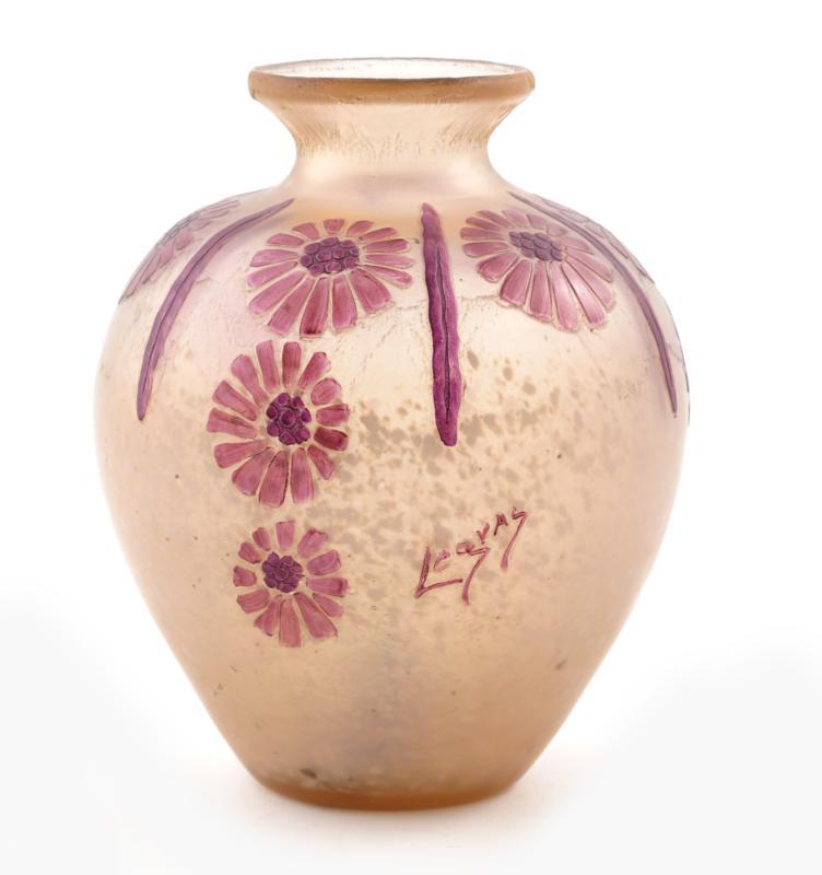 A Legras cameo glass vase, ovoid mottled glass, decorated with aster flowerheads painted in shades of red signed Legras 22cm. high