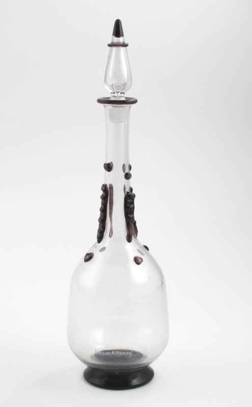 A Daum Nancy glass decanter and stopper, with applied amethyst trails and prunts acid etched Daum Nancy 32cm. high