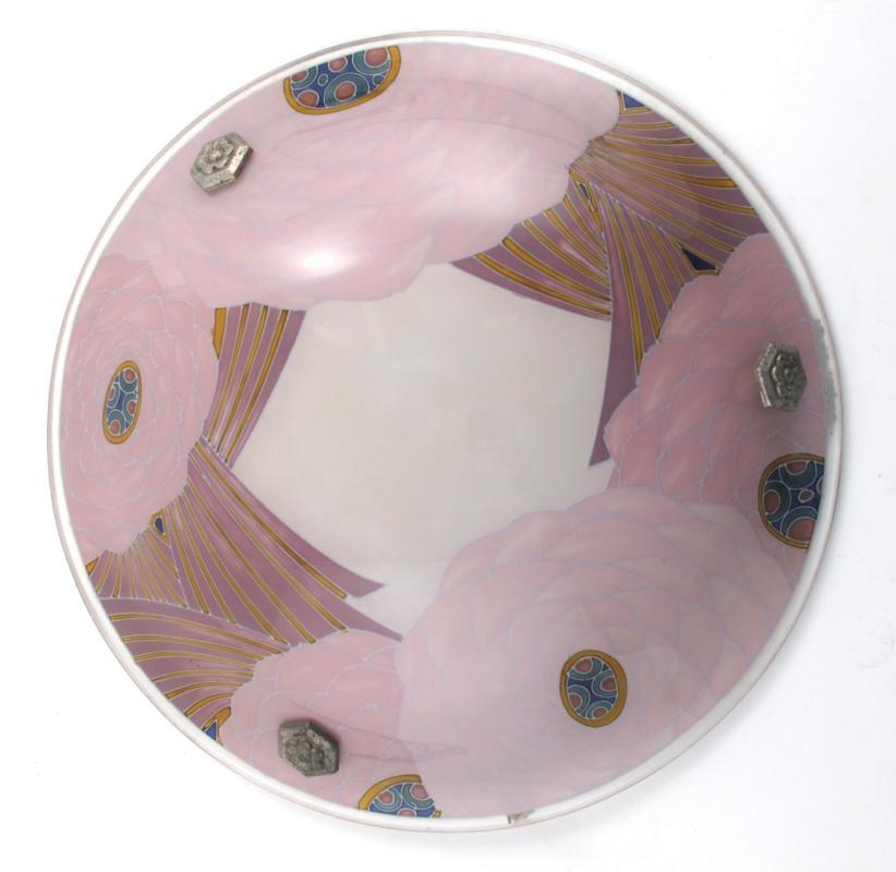 A Loys Lucha internally enamelled glass ceiling light, bowl shaped, decorated with geometric pink dahlia flowers, remains of hanging silk threads signed to the rim, 35.5cm. diam.