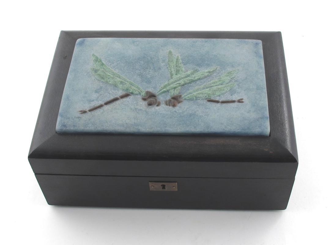 A Daum pate de verre glass panel, designed by Jacques Adnet rectangular, with two dragonflies, set in an ebonised wood box cast Daum and Adnet signature 20 x 12.5cm.