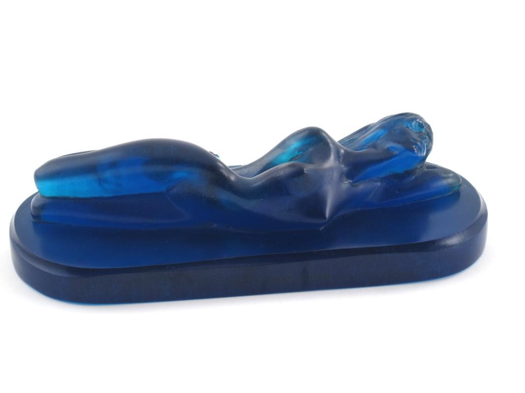 A sapphire blue glass figure of a woman, cast from a model by Charles Korschann, modelled lying on her side, on a rounded rectangular base, cast signature Charles Korschann, 24cm. wide