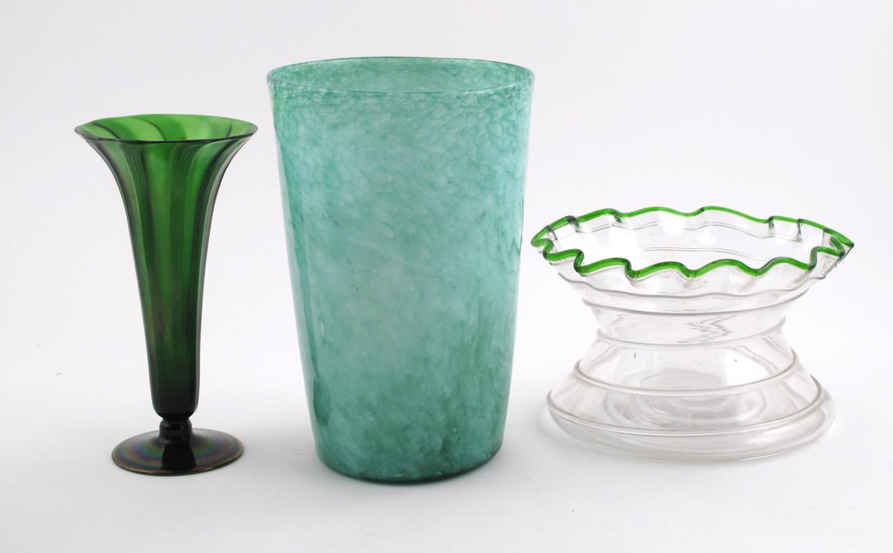 A Nazing glass vase, flaring cylindrical form, mottled white and green cased in clear, an iridescent glass trumpet vase and another glass vase unsigned 23cm. high