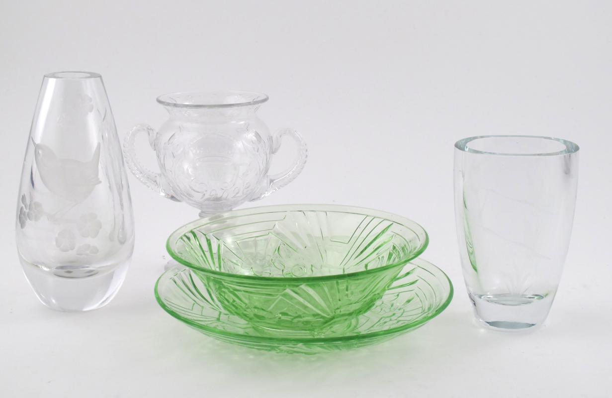 A Jobling press moulded green glass salad server and saucer, decorated with floral panels, and a glass twin-handled royal commemorative vase, inscribed E R 1902 inset to the stem with a coin, a Strathearn etched glass vase by Gordon and two other items unsigned 21cm. wide