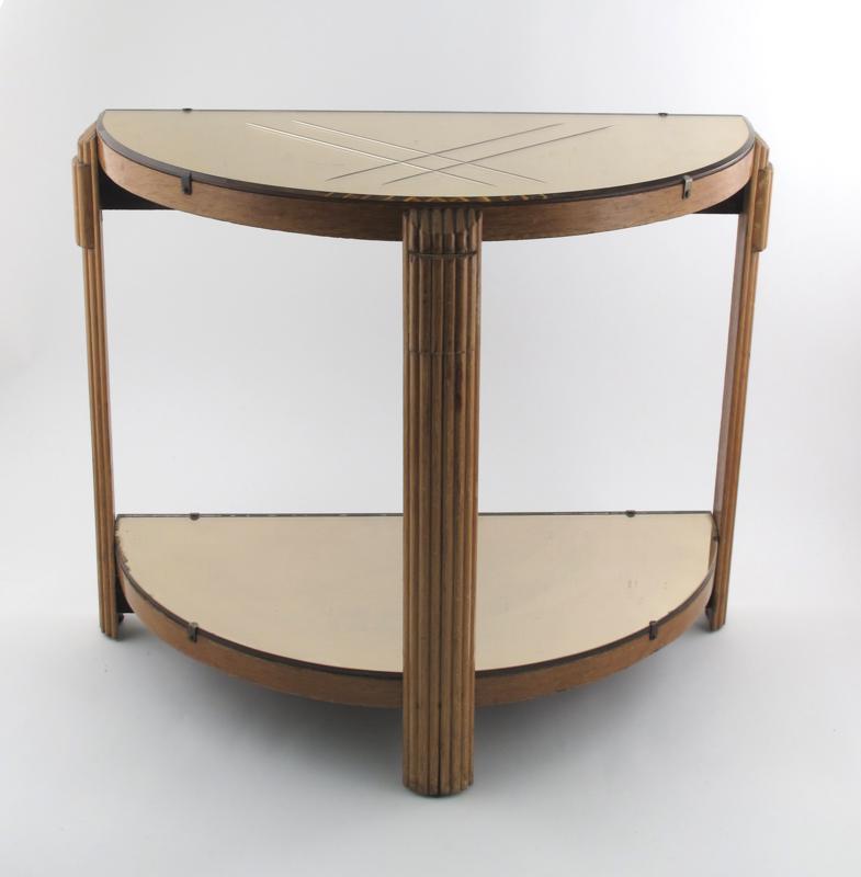 A peach tinted glass mounted wood occasional table, D shaped section, the top surface with cut groove decoration unsigned 65cm. wide