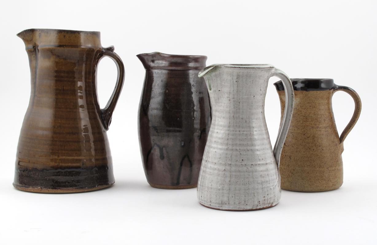 a Lowerdown Pottery tin-glazed earthenware jug, another David Leach Lowerdown jug smaller, two David Leach tea cups and saucers, and two jugs by other artists impressed seal marks 21cm. high