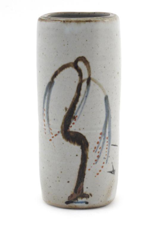 a Lowerdown Pottery vase, square section, painted with a willow tree design in tenmoku, blue and iron red impressed seal marks 16cm. high