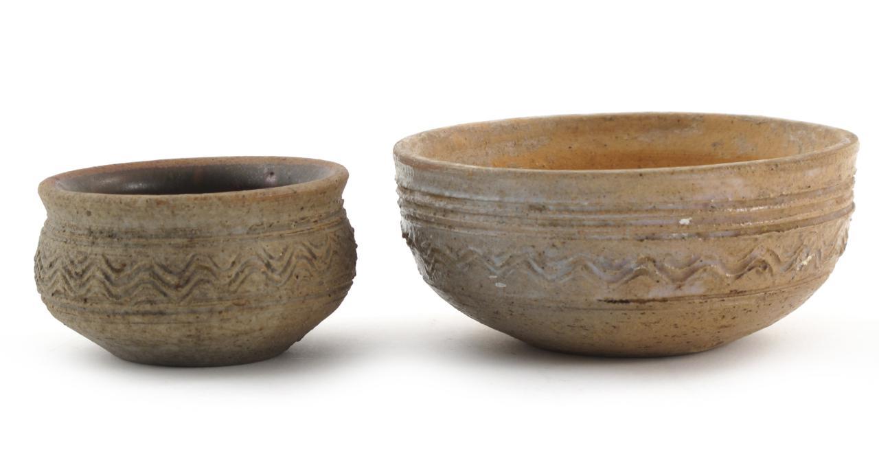 a small stoneware bowl, the exterior with incised combed decoration, glazed to the interior, and another similar impressed seal mark, painted glaze details 7cm. diam.