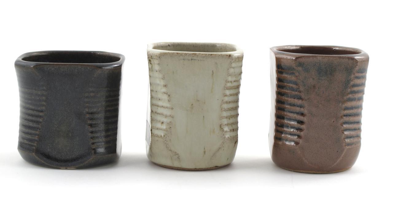 a stoneware unomi, square section, covered in a tenmoku glaze, another similar and a porcelain unomi impressed and painted B marks 9cm. high