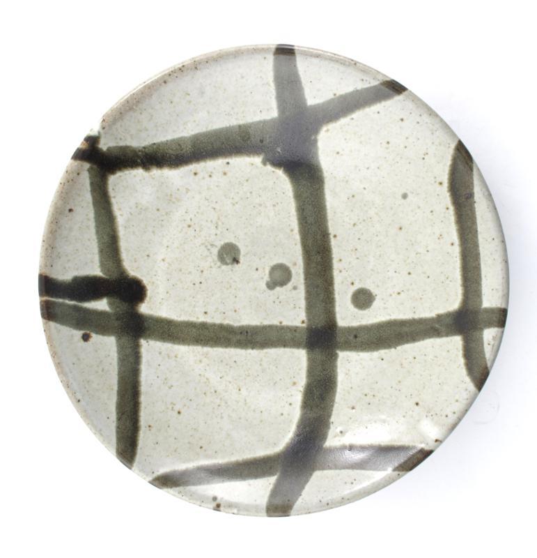 Phil Rogers (born 1951) a Marston Pottery stoneware charger, decorated with simple brushed design on ash glaze impressed seal mark 27cm. diam.