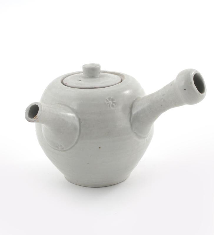 a Leach Pottery stoneware teapot and cover, ovoid with side handle, impressed flower decoration, glazed pale celadon, impressed seal marks, small chip to spout 19cm. wide
