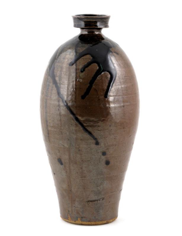 a stoneware vase, tall slender form with collar rim, covered in a tenmoku glaze, with splashed decoration to shoulder incised monogram 45cm. high