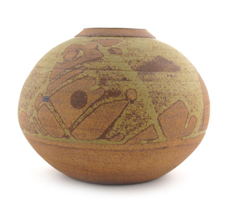 Michael Casson (1925-2003) a stoneware ovoid vase, painted in resist with geometric panels in rust on an ochre ground impressed seal mark 18cm. high