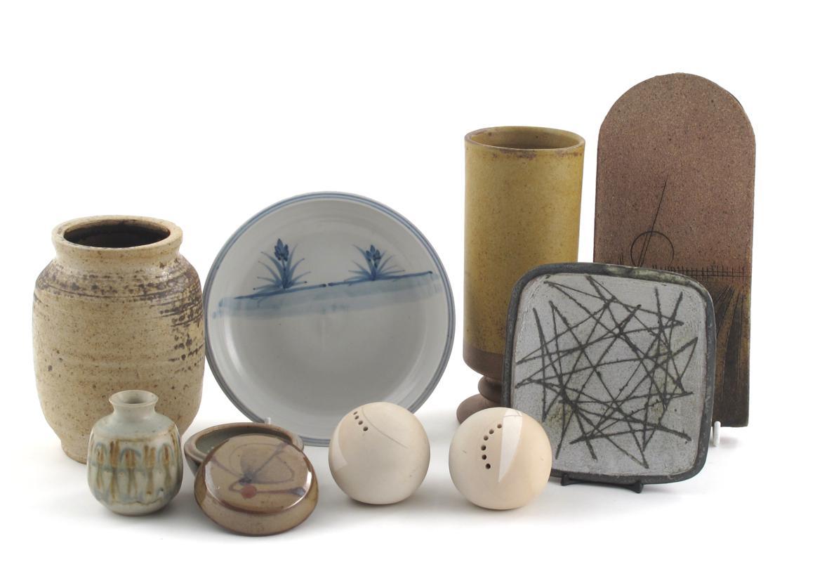 a footed bowl, painted in blue with grasses, a Lowerdown Pottery vase and a collection of various studio pottery various marks 16cm. diam.