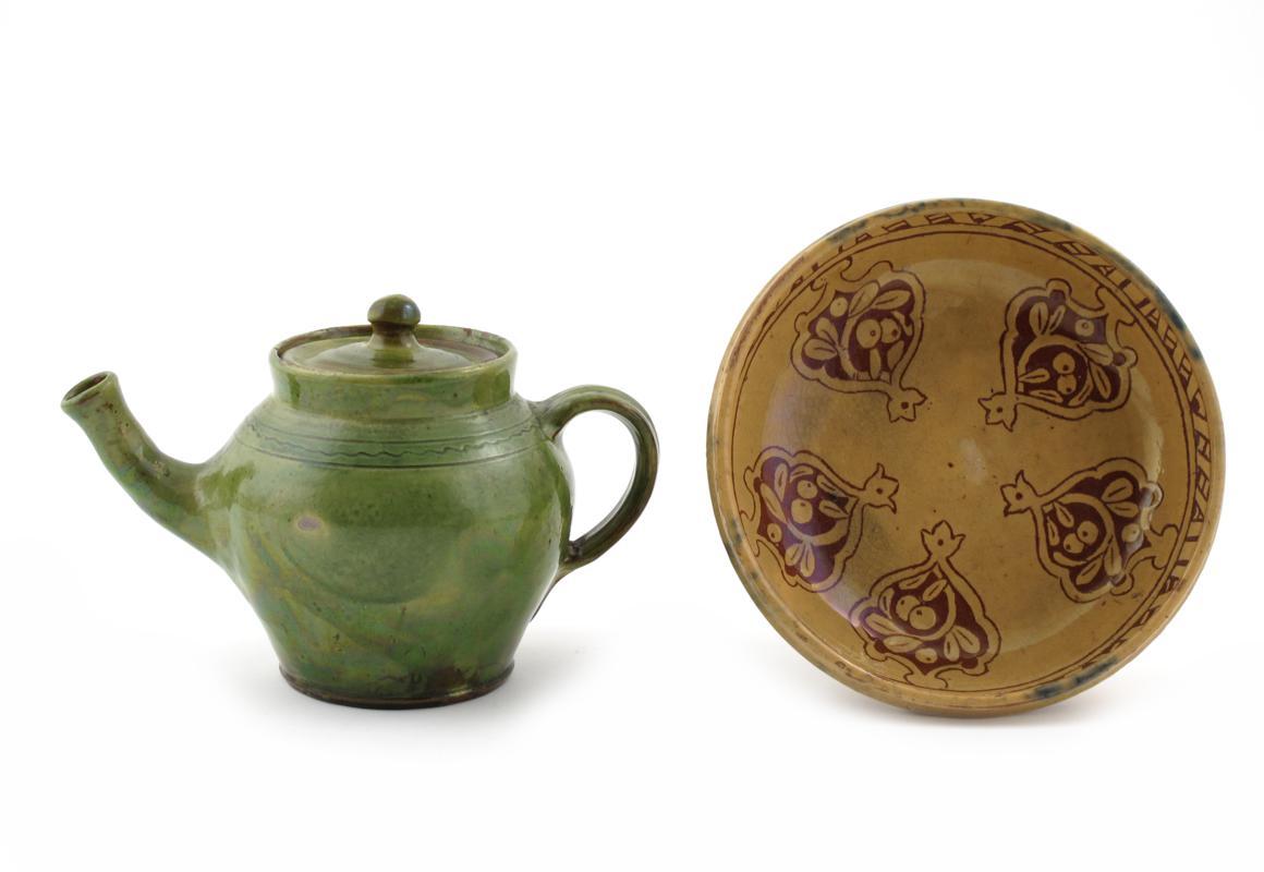 a sgraffito decorated terracotta bowl by M B Hill, decorated with panels of Iznik designs under a tan glaze, and a Farnham Pottery teapot with incised decoration incised marks to bowl 19.5cm. diam.