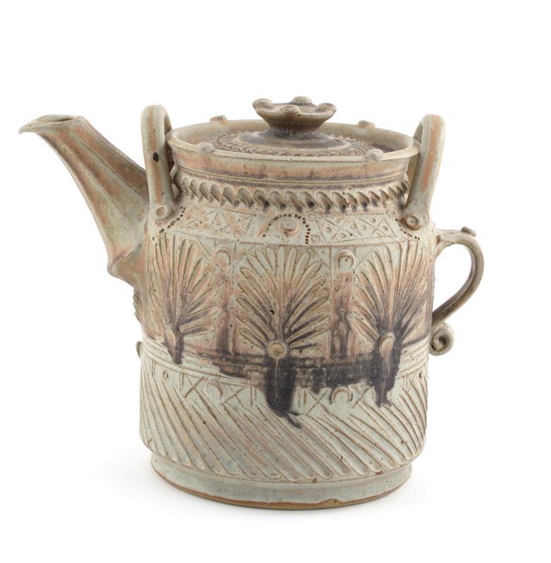 a massive stoneware pouring vessel and cover, incised with bands of stylised foliate and geometric panels, glazed in ash incised signature to base 25cm high