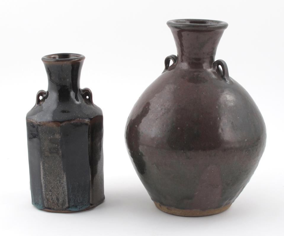 a Leach Pottery cut-sided vase, with pinched loop handles, covered in a rich Tenmoku glaze, and another, larger Trevor Corser vase impressed seal marks to both 24cm. high