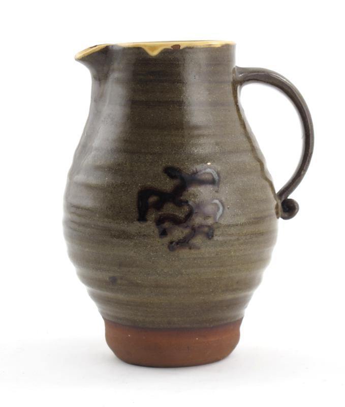 Sam Haile (1909-1948) a bellied jug, slip decorated in tenmoku over celadon, impressed seal mark, hairline to top rim, minor glaze loss 20cm. high