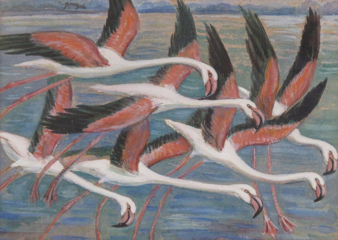 ‡'Flying Flamingos in Carmargue' a watercolour design for a pottery panel, by Stella R Crofts, framed applied paper labels to the reverse, one inscribed in ink 'To Miss Sargeant with happy memories Doris Crofts, July 1958 image 24.5 x 17cm.