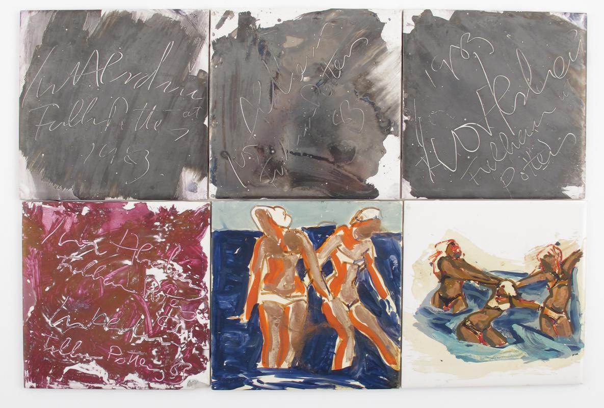 A Fulham Pottery tile by Jean-Paul Landreau painted with two bathers, another similar and four tiles with etched inscription dated 1983 15.5cm. square