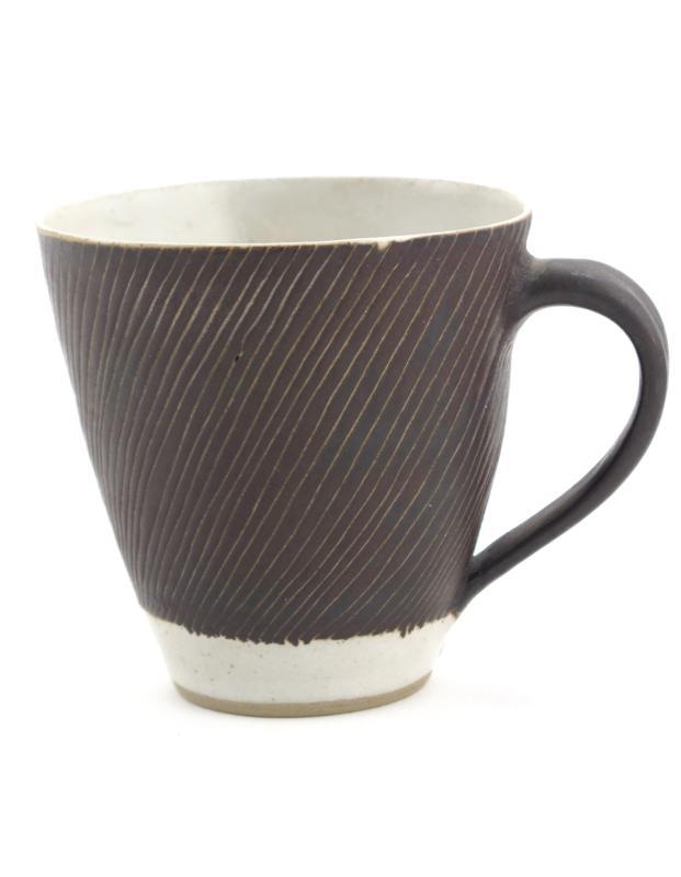 a stoneware cup, decorated in off white with a bronze glazed exterior, sgraffito decorated with lines impressed seal mark, professionally restored inside 7.5cm. high