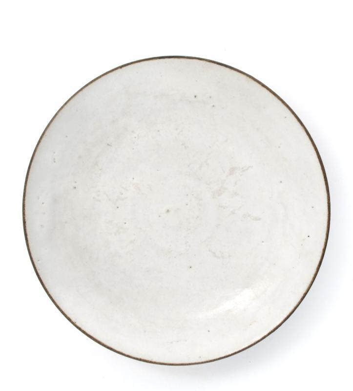 ‡Lucie Rie (1902-1995) a stoneware plate, glazed off white with bronze rim, impressed seal mark, minor professional restoration to rim 16cm. diam.